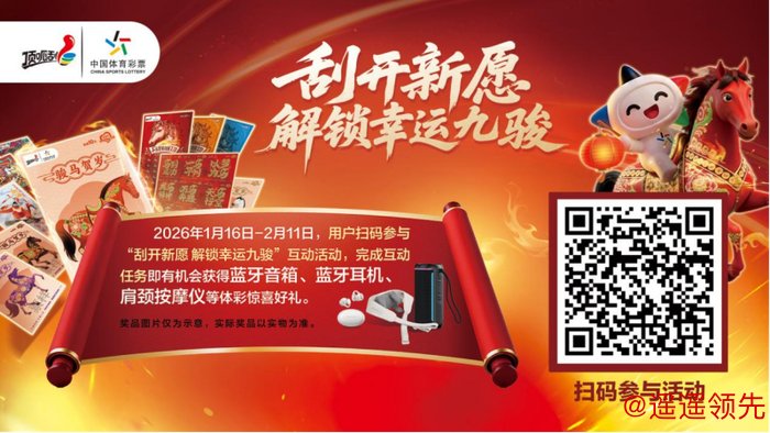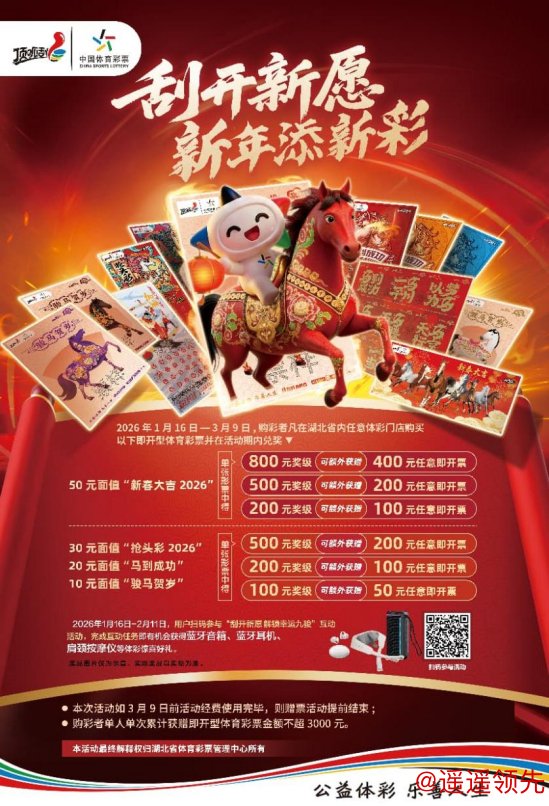 骏马踏春,好运来敲门!2026马年新春,湖北体彩带着满满惊喜,开启“刮开新愿,新年添新彩”主题活动——从1月16日到3月9日九游娱乐app,购彩赢好礼、互动抽大奖,让这个新年“彩”气满满!
